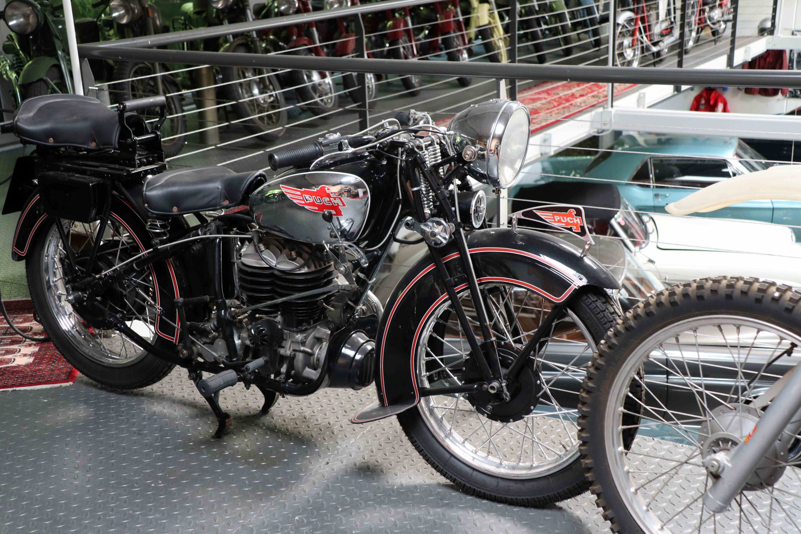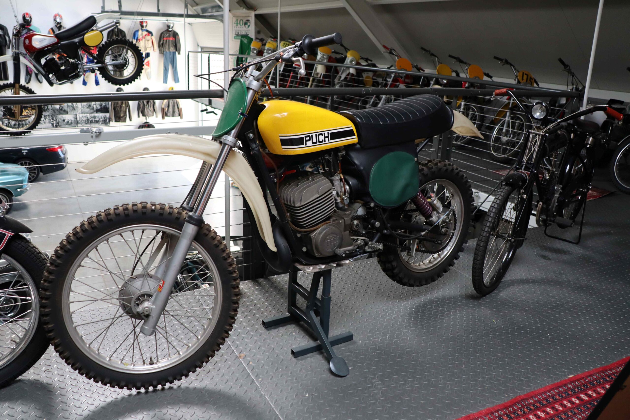 Der Großteil der Motorräder findet sich aber auf einer Galerie, die faktisch wie ein Museum eingerichtet ist. Neben der Bar gleich eine Puch S4 der Wehrmacht, die eine lange Geschichte hinter sich hat. Von den Besatzungsmächten requiriert, wurde sie einige Zeit in Wien gefahren und landete dann auf Sizilien, wo sie zur Rennmaschine umgebaut, ein zweites Leben führte, bevor sie wieder im Österreichischen Weinviertel landete.