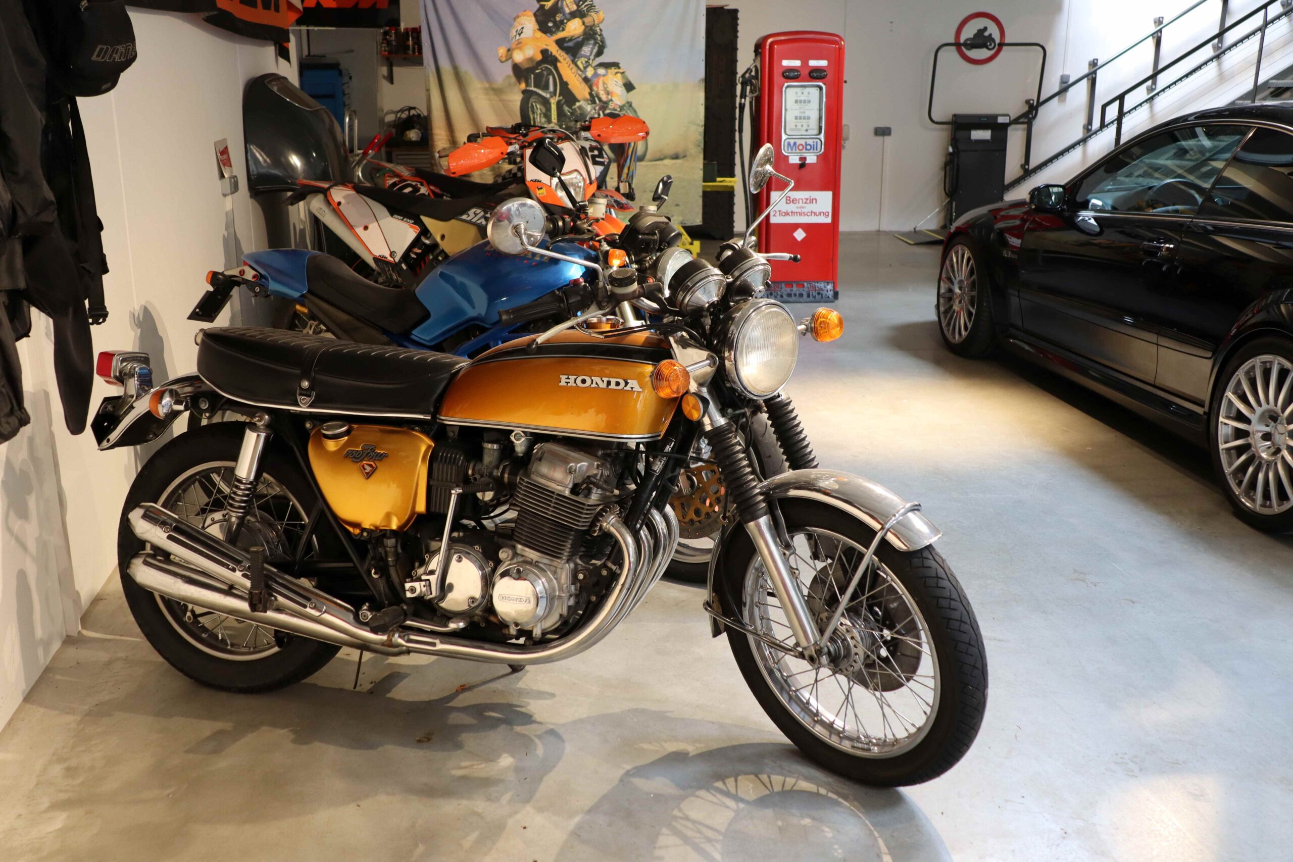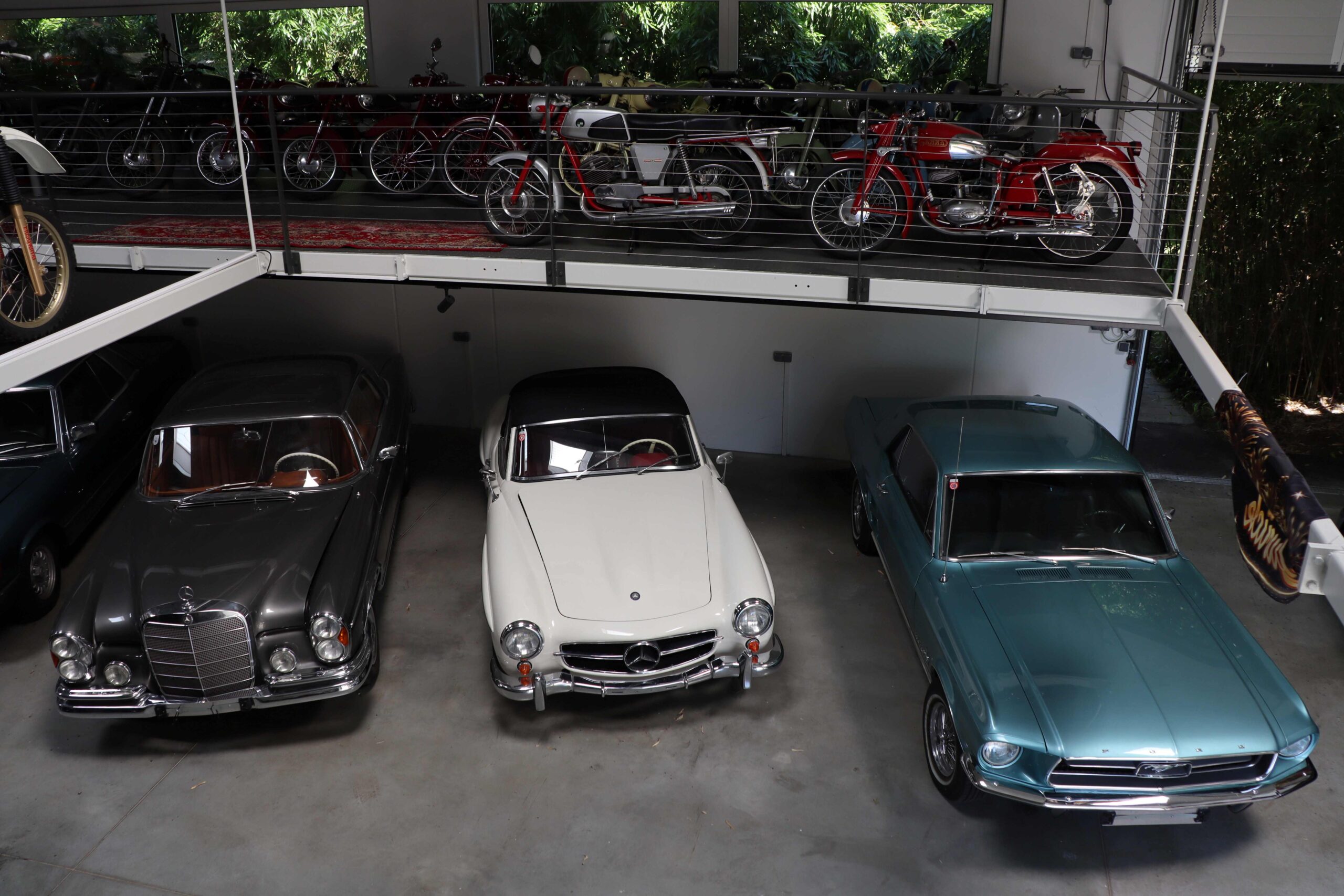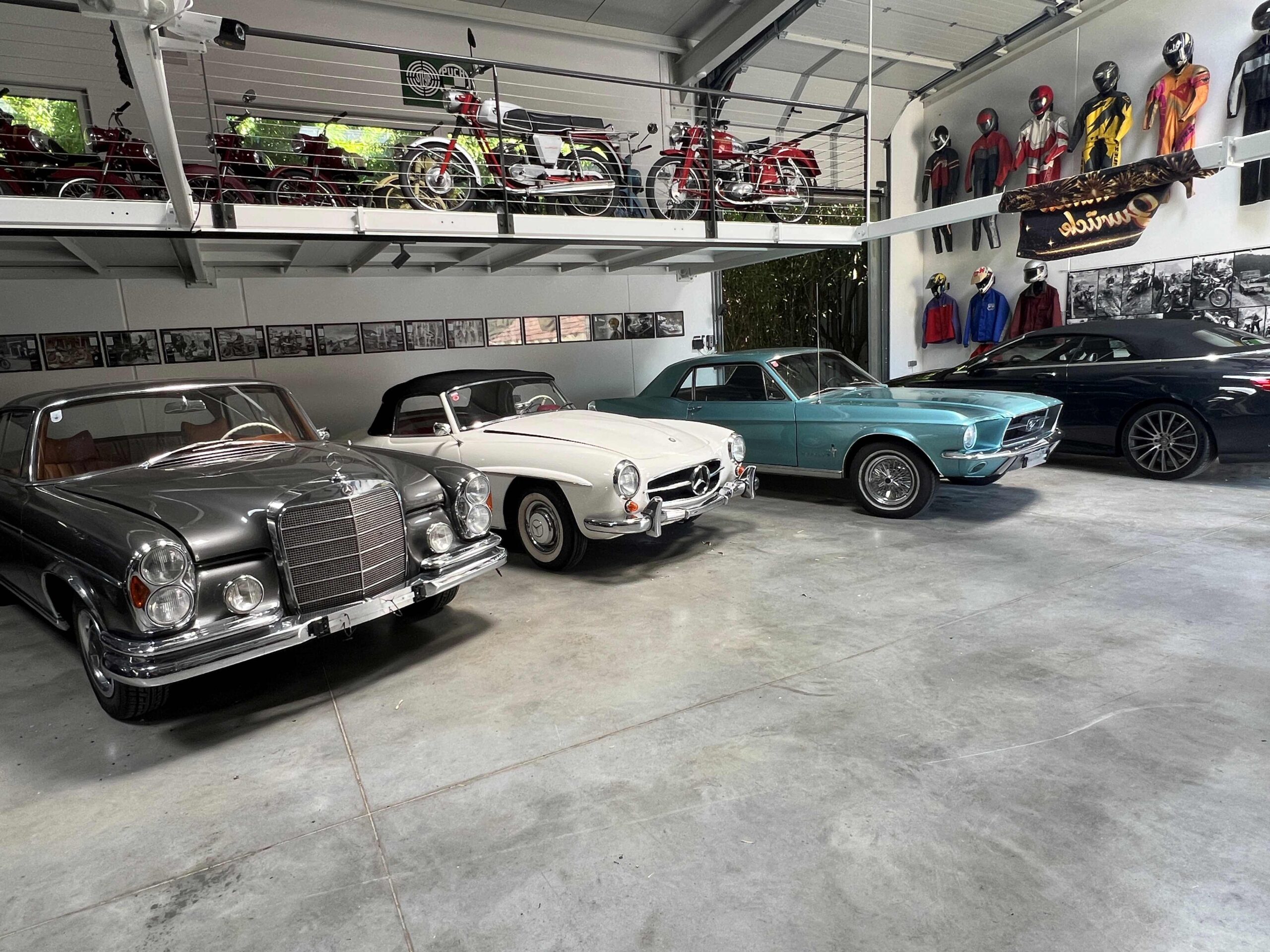Bereits im Vorzimmer wird der Besucher neben dem Hausherrn und Haushund „Giacomo“, von drei Pretiosen empfangen, einer Puch 125 S und dem passenden Tourenmodell 125 T, die gleich nach dem zweiten Weltkrieg produziert wurden. Glanzstück dazwischen eine HRD Vincent Rapide („Weil ich Rapid-Anhänger bin, musste das ins Haus“) . Motorradfahren ist oder besser gesagt war eine große Leidenschaft des Pensionisten, der seit einem tragischen Motorradunfall 2023 im Rollstuhl sitzt. Seiner Begeisterung für Motorräder, aber auch für Autos tat das keinen Abbruch, im Gegenteil. Die Garage ist eher wie ein Museum als ein schnöder Abstellplatz für Fahrzeuge. Im unteren Teil parken einige Autos vornehmlich der Marke mit dem Stern am Kühler, das Glanzstück ist ein 190 SL Cabrio. „Den hat mir meine Frau zum Fünfziger geschenkt“, erzählt Wolfgang stolz. Der Ford Mustang ist fast schon ein „Must have“ in einer Sammlung, daneben gibt es noch einige andere Mercedes Modelle aller möglichen Baujahre, meist nicht gerade untermotorisiert.