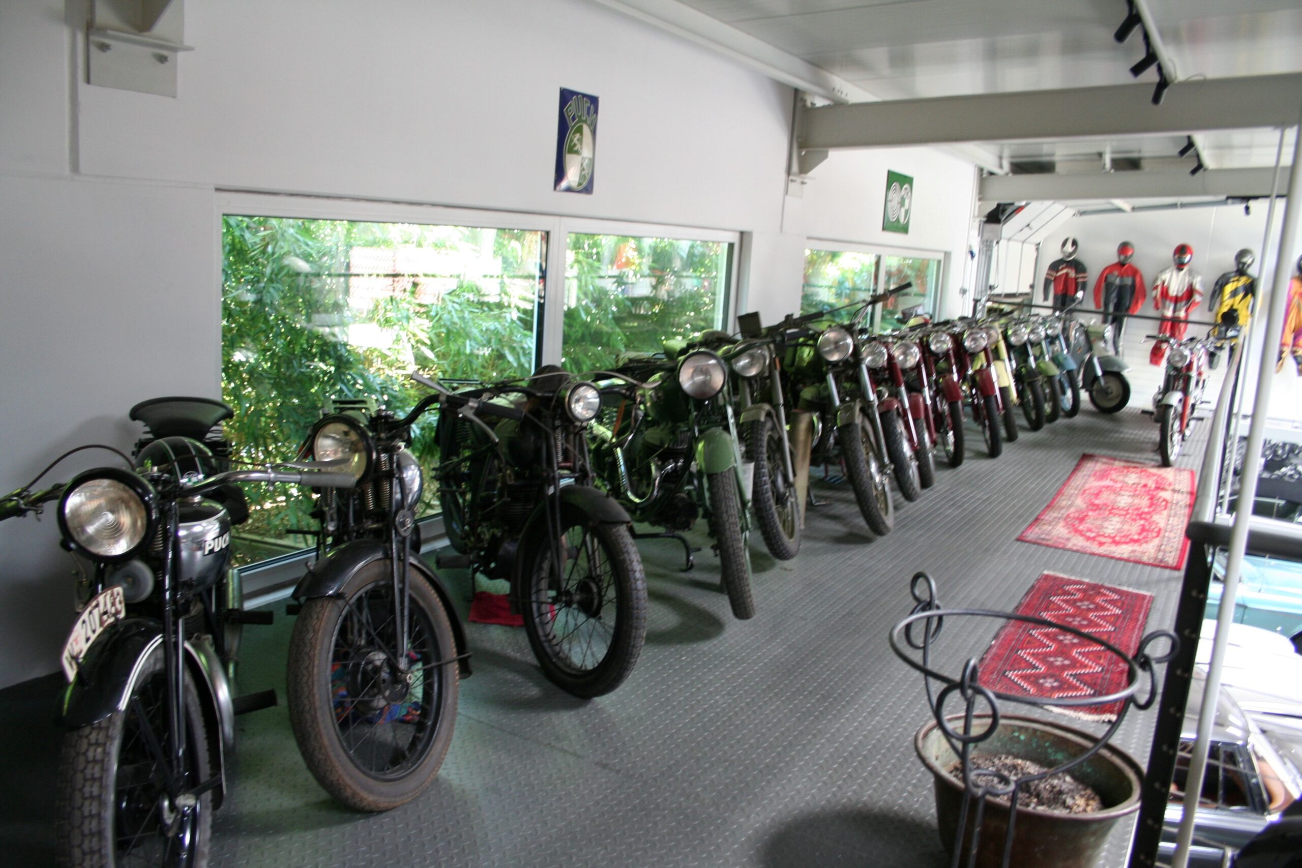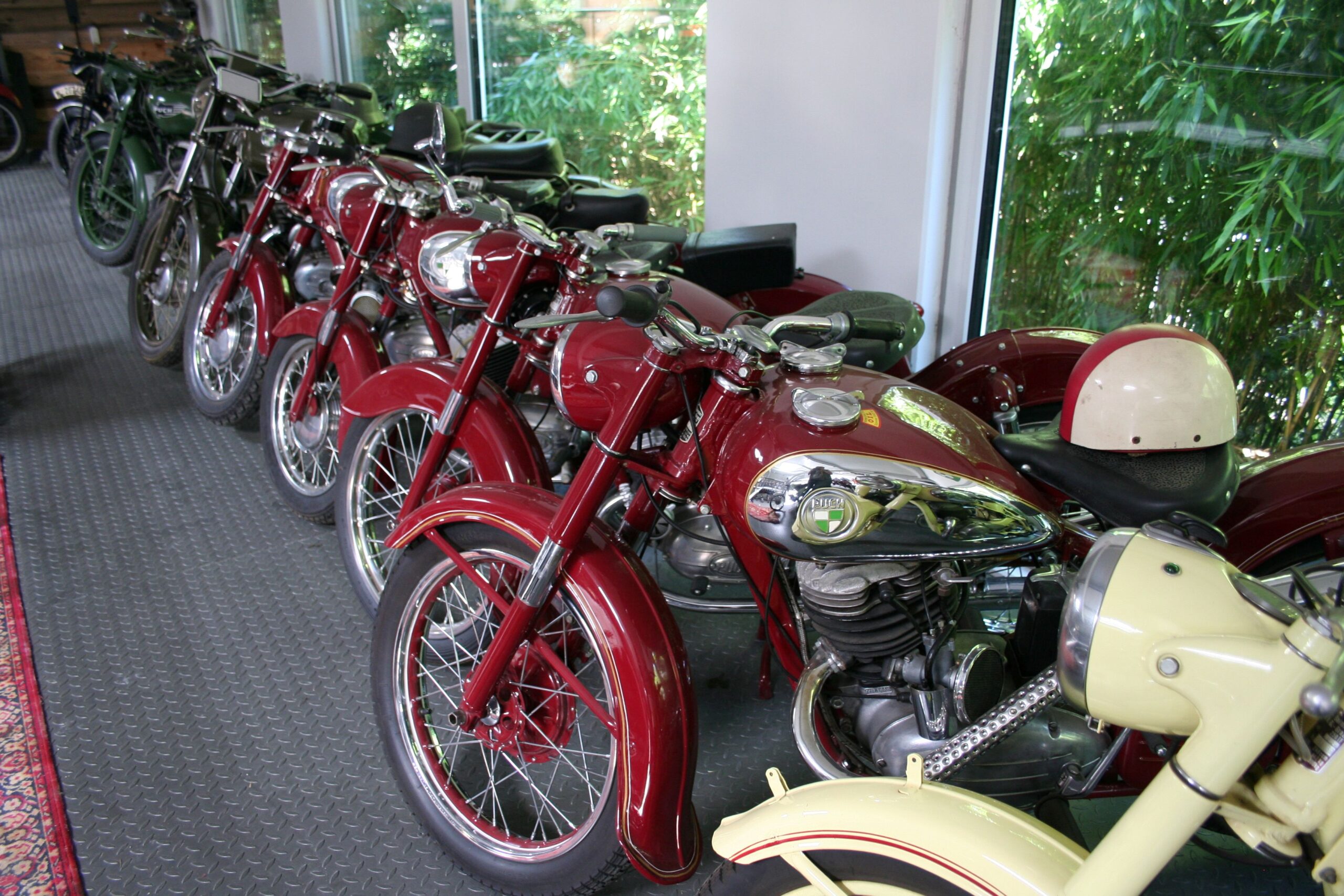 Die weiteren, meist Puch-Motorräder auf der Galerie zu beschreiben, würde wohl den Rahmen sprengen, aber es finden sich etliche typisch rote „S“ Modelle aus den Fünfzigern und Sechzigern wie 250 SGS s 125 TFs usw. Daneben auch etliche Militär-Puchs, denn das österreichische Bundesheer schätzte die meist aus Werks Motocrossern entwickelten Motorräder sehr, sie waren auf den Gebirgswegen unschlagbar.