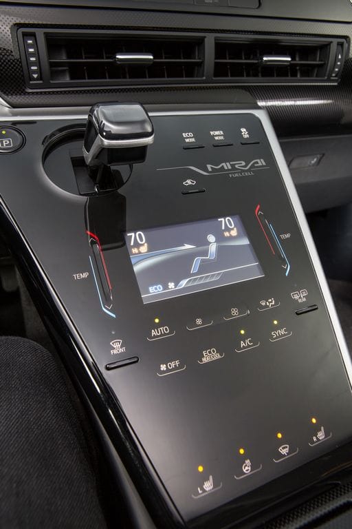 Der Mirai nimmt über die Frontseite des Wagens den benötigten Sauerstoff auf, welchen er in Kombination mit dem Wasserstoff zu Strom umwandelt. Das „Abfallprodukt“ ist Wasser, welches am Heck des Fahrzeugs ausgeschieden wird. Aus dem mit 700 bar komprimierten Wasserstoff kann die Brennstoffzelle des Toyota extrem effizient Strom erzeugen. Die Brennstoffzelle gewinnt pro Liter Bauvolumen 3.1 kW/Liter Strom (Volume power density). Das gut die doppelt so viel wie bei seinem Vorgängermodel. Das ist ein absoluter Spitzenwert. Die Tanks besitzen eine Kohlfaserummantelung um den Inhalt auch unter extremen Belastungen – wie sie bei einem Unfall auftreten – zu sichern. In den Wasserstofftanks speichert der Mirai 5 kg Wasserstoff. Dies entspricht ca. 122.4 Litern Wasserstoff bei 700 bar. Der Mirai verbraucht pro 100 km 25,5 Liter (bei 700 bar) oder 1,042 kg Wasserstoff. Ein relativ hoher Wert. Der Honda FCX Clarity braucht laut offiziellen Angaben nur 0,85 kg Wasserstoff pro 100 km.